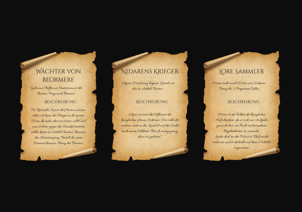 „Doch, natürlich. Nur zu.“ Aethel geht durch die Tür, dreht sich im Türrahmen noch einmal kurz um. „Ach, Reisender. Da vorne ist ein Questboard. Vielleicht solltest du dir das erst ansehen, bevor du durch die Tür trittst. Und wenn du einen Dornenschimmer brauchst, sag Bescheid.“