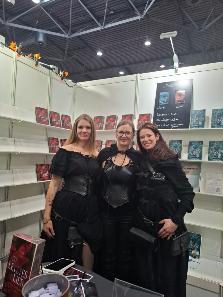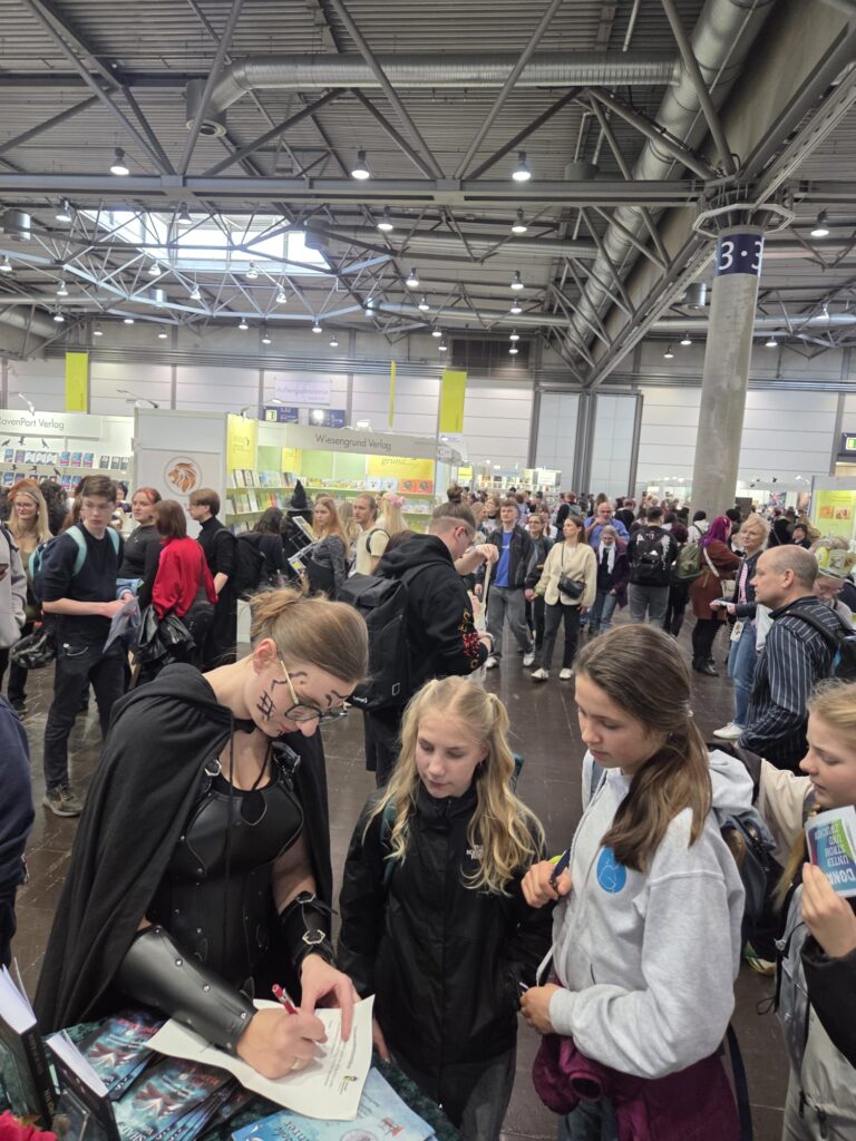 Drei junge Frauen schlendern an den Stand und es stellt sich heraus, dass es drei liebe Bookies sind. So durfte ich Sarah (mit der ich einen Büchertausch gemacht habe, Woodland Queen) und Lilly, mit der ich mich regelmäßig austausche und über deren humorvollen Support ich mich sehr freue, persönlich kennenlernen. Was auf so einer Messe so alles geht…