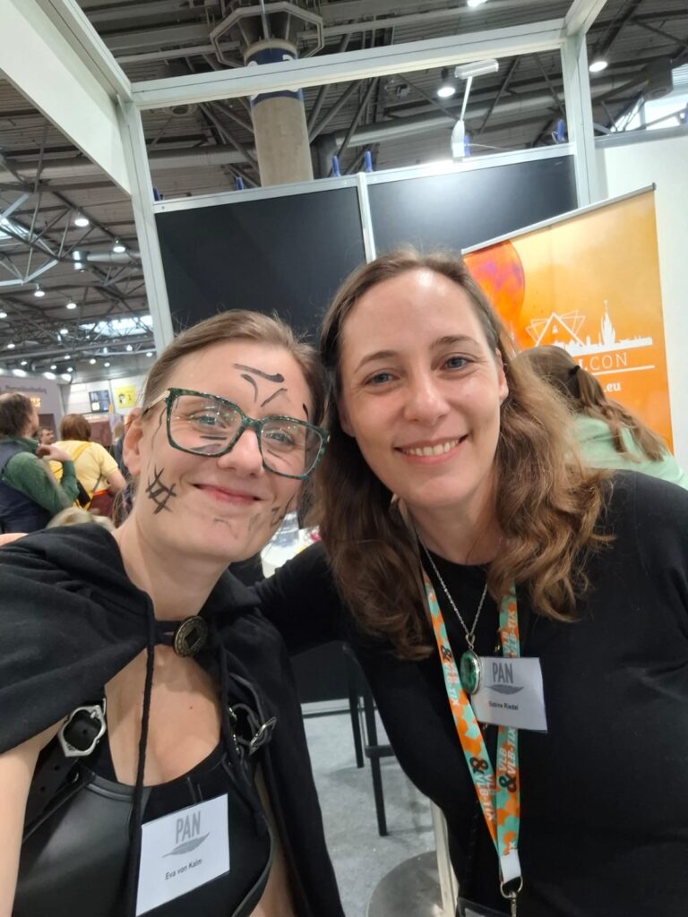 Odine Raven, deren Buch für den Seraph nominiert war, gehört zu den Autorinnen, die wie ich gelegentlich ihre Lesung mit Gesang begleiten. So haben wir uns auf dem BuCon schon zusammengefunden und durften uns jetzt wiedersehen, mit dem Versprechen, eine Runde Abba auf die Nominierung zu singen. Und das haben wir dann auch direkt getan: Thank you for the music (books), am Stand des Verlags der Schatten. Übrigens ist sie Mitherausgeberin der Humorvollen Spätlese. Odine, ich danke dir für diese coole Aktion und auf der nächsten Messe, wo immer wir uns sehen mögen, gerne wieder!