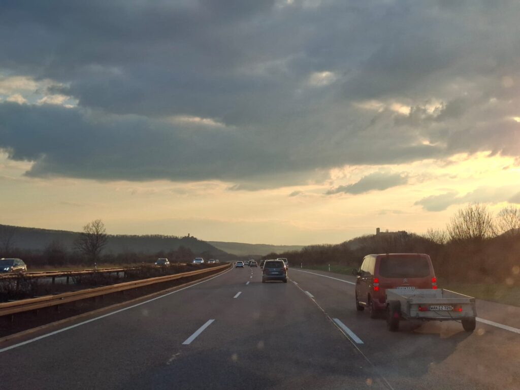 Die Fahrt startete in der morgendlichen Dunkelheit mit Eis auf der Autoscheibe. Vier Tage Leipzig und zwei Kleinkinder. Das hieß für mich: Logo, ich komme, aber ich nehme meine ganze Familie mit. Und damit mein Mann mit den Kindern nicht in Leipzig allein gestrandet ist, sind auch meine Schwiegereltern mitgefahren. Da braucht es schon einen 9-Sitzer um die Quest „Anfahrt nach Leipzig“ zu bewältigen. Und während die Beschaffung des Fords ziemlich plötzlich doch noch ganz gut geklappt hat, war die Fahrt zumindest für den Großen definitiv das Highlight der Reise.