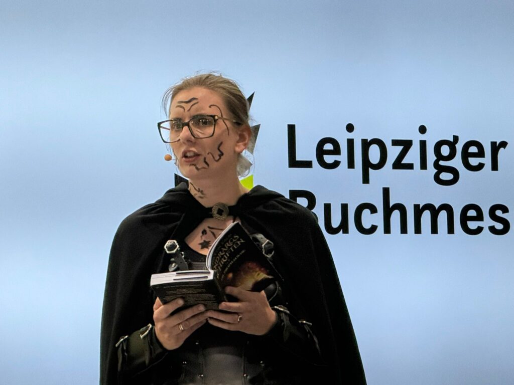 Was ich an der Leipziger Buchmesse mag, sind die vielen Cosplayer*innen. Schon 2018, als ich das erste Mal dort war, ist das eine der Sachen, die mich (positiv) überwältigt hat. Ich gebe ja zu, dass ich heute auf Messen in Rüstung herumlaufe, rührt genau von dem Gefühl meiner ersten Leipziger Buchmesse, wo ich die vielen Kostüme sehen durfte und gedacht hab: Will ich auch.